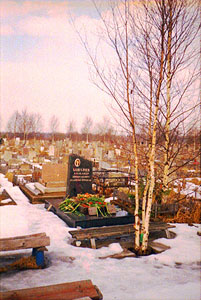 Нужно пройти мимо церкви, выйти на большую дорогу и пройти немного вперед до узкой дороги, которая уходит направо. Свернуть на эту дорогу и идти прямо до 3 участка 3 квартала. Ориентиры третьего участка - на правой стороне дороги - дерево (два сросшихся тополя), ржавый указатель без обозначений, каменный переход направо к могилам. Около могилы растут три тонкие березки и одна потолще(***). На березах колокольчики (***). А вообще при входе на кладбище есть схема (***), по которой можно найти нужный участок. К тому же администрация кладбища в курсе, где похоронен СашБаш. Можно спросить - покажут.